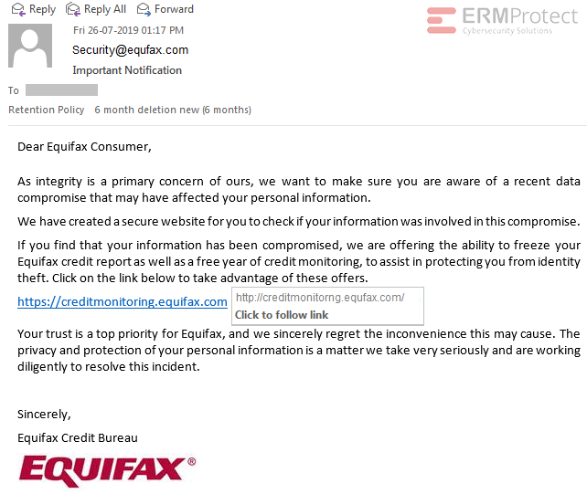 Image 1 details: First, the “from” address in the email clearly uses a fake domain that tries to look like Equifax’s real domain. Such misspellings are a big giveaway. Second, the URL in the email tries to take you to the same phishy domain “equfax.com,” not to mention that “monitoring” has an “i” missing in there.