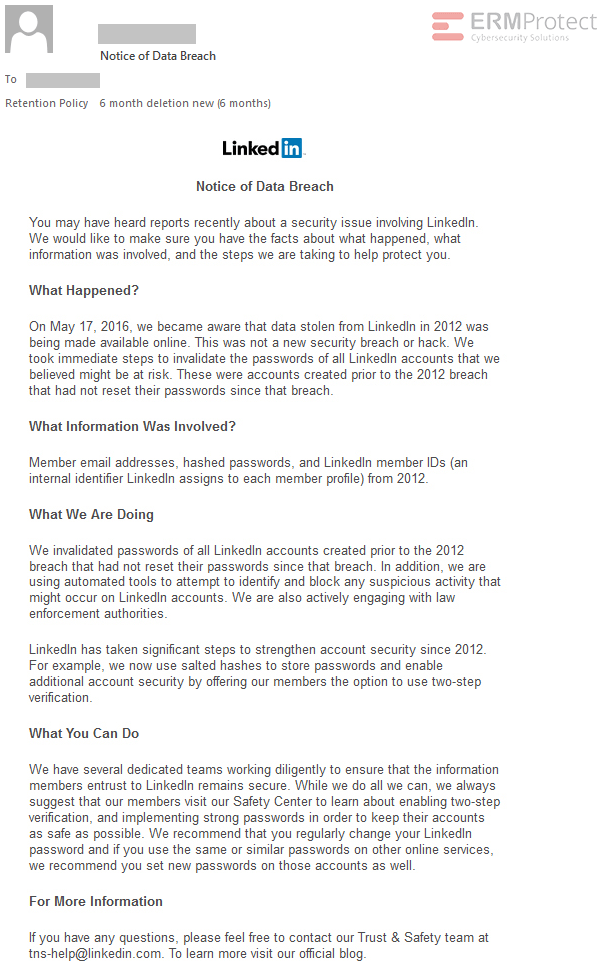 Image 2 details: This email from LinkedIn is legitimate. It provides all the significant details of a data breach including cause, data involved, actions taken, and where to get more information. Further, it doesn’t contain any links. Always be cautious and look closely at notices of data breaches. Scammers often use these incidents to send their own versions of phishing emails.